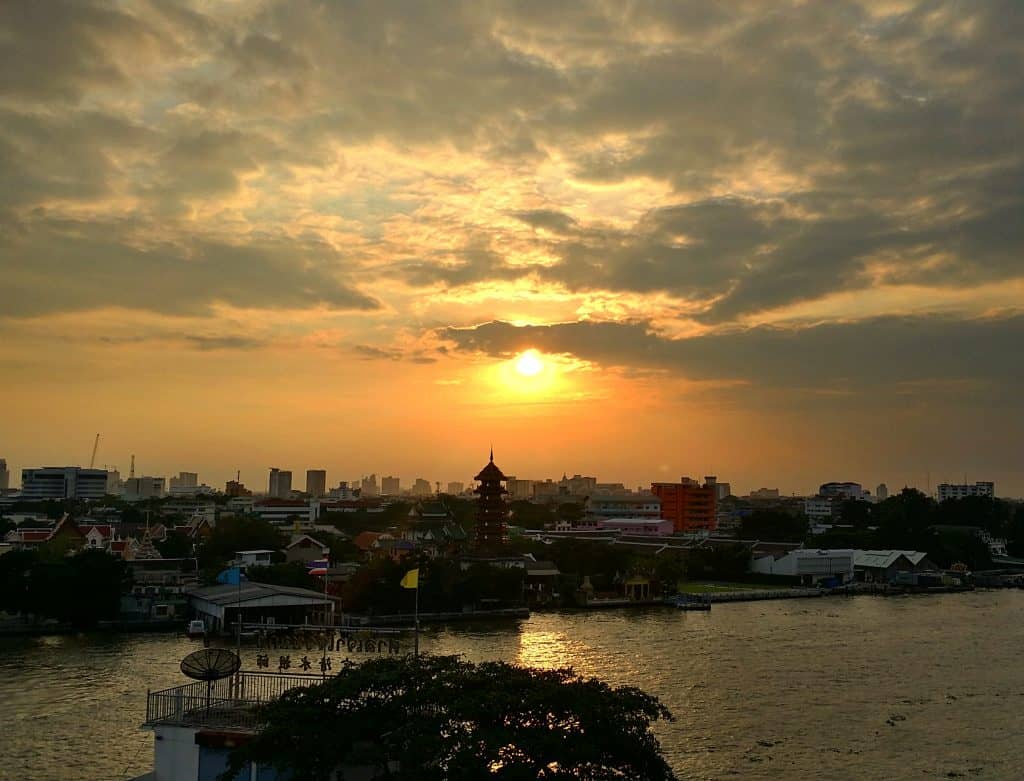 While enjoying sunset cocktails on the rooftop of the Riverview Guesthouse in Bangkok, we were drawn to the edge of the deck by what sounded like a celebration.